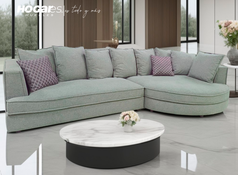 Sala moderna con amplio Chaise Longue en forma redonda, muy comoda y acolchonada ideal para esas tardes de película en familia o amigos